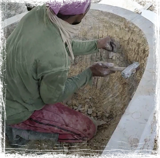 The artisan skillfully sculpts a block of marble, transforming it into a beautifully crafted bathtub.